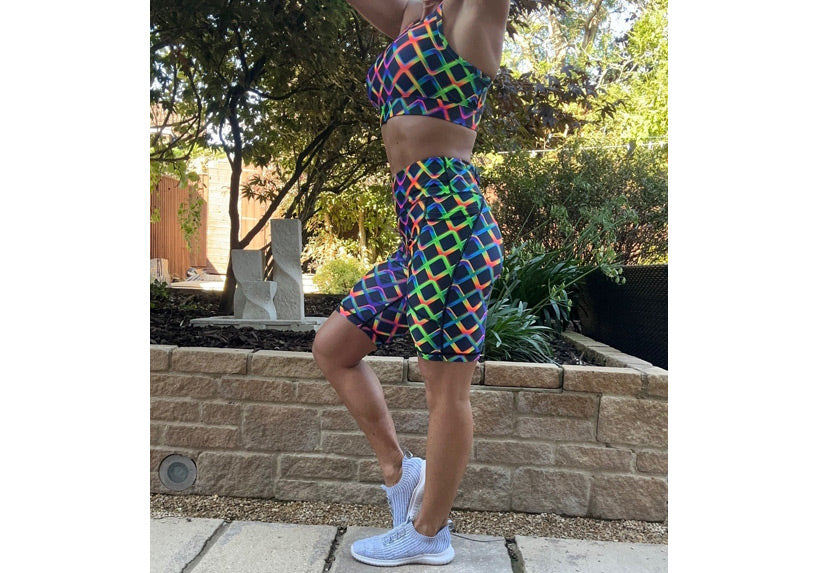 Train in style with our Chainlink long shorts. Featuring a bold neon grid over black, these high-waisted shorts include optional deep thigh pockets and a discreet rear zip pocket. Their supportive, squat-proof fabric keeps you confident through cycling, cardio, and strength training.