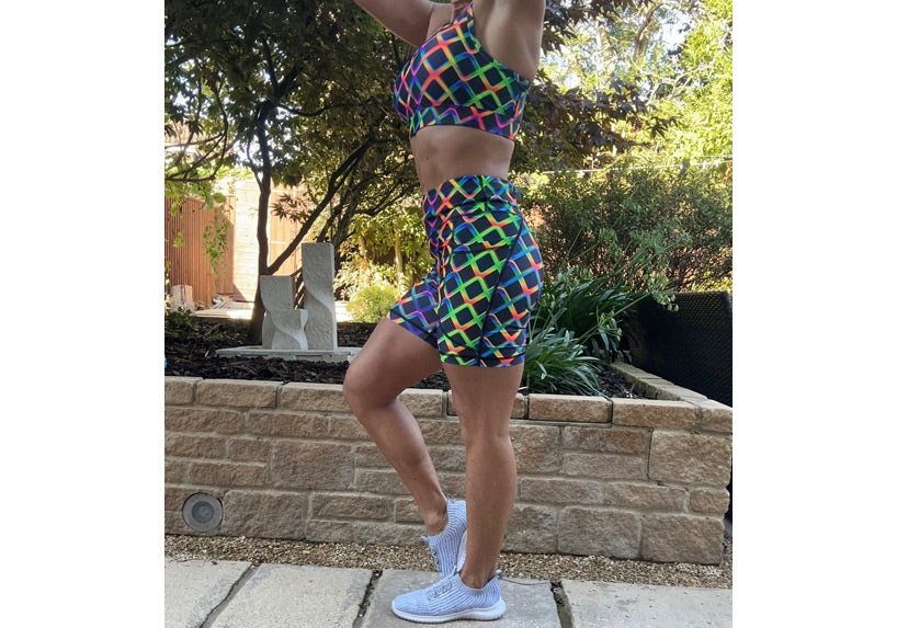 Step into power with our Chainlink mid shorts, designed with a vivid neon chainlink print. High-waisted, squat-proof, and sculpting with optional thigh pockets and a rear zip pocket. Perfect for gym sessions, running, hiking, or dance.