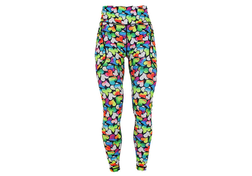 Bring playful energy to every workout with the Crazy Love full length leggings, covered in white and neon cartoon hearts for a bold, feel-good look. Made from soft, squat-proof performance fabric, these high waisted leggings offer supportive comfort that stays put while you move. They feature a secure rear zip pocket and the option to add deep thigh pockets if you need extra storage. Available in regular, tall and petite lengths. Perfect for running, gym training, yoga, pilates, dance fitness and bright everyday casual wear.