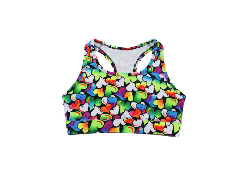 Complete your look with the Crazy Love racer back bra crop top, finished with fun cartoon hearts in white and neon shades. Offering low to medium support, this soft and breathable bra is designed to move with you. Perfect for yoga, pilates, gym sessions, dance fitness and relaxed everyday wear.