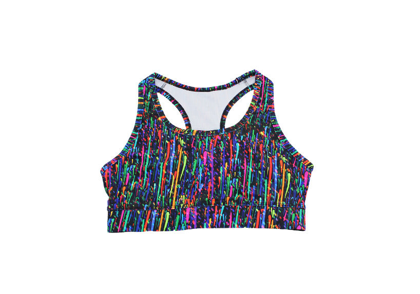 Pair your look with the Warp Speed racer back bra crop top, decorated with dynamic multicoloured paint streaks on a sleek black base. Offering low to medium support and a soft, breathable feel, it allows full freedom of movement thanks to its racer back cut. Ideal for pilates, yoga, gym training, dance and vibrant everyday layering.