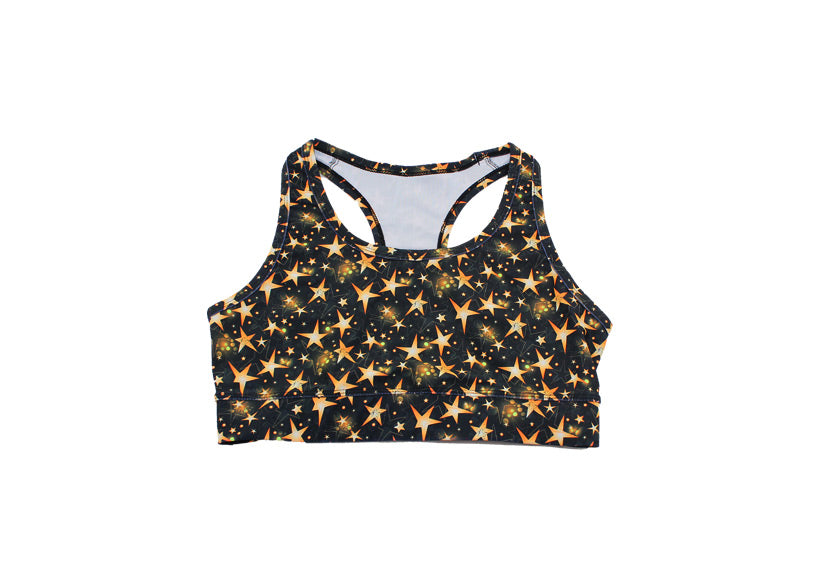 The Stargazer racer back bra crop top completes your celestial look with golden stars on black. Offering low to medium support and a soft, breathable fit, it’s designed for freedom of movement and comfort. Perfect for yoga, gym sessions, pilates, dance, or layering under everyday outfits for a touch of starry style.