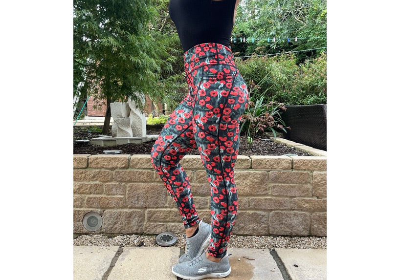 Stay warm and stylish with our fleece-lined Poppy Field winter leggings. High waisted with optional thigh pockets, a rear zip pocket, and available in tall, petite, and regular lengths. Perfect for winter running, hiking, skiing, or keeping cosy on cold days while still enjoying bold floral style.