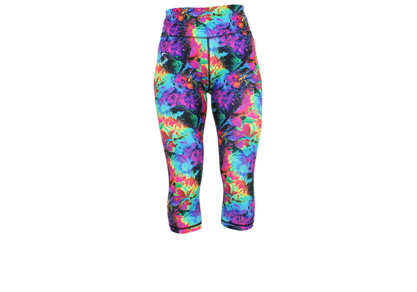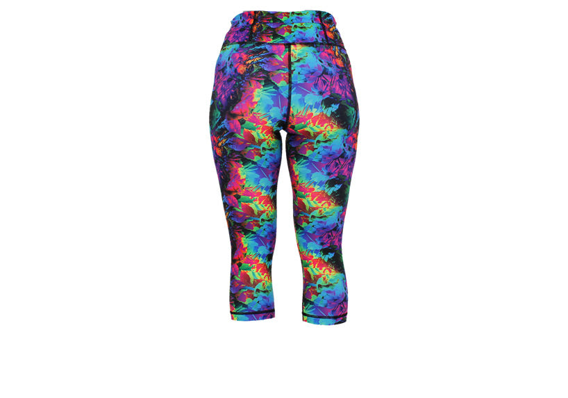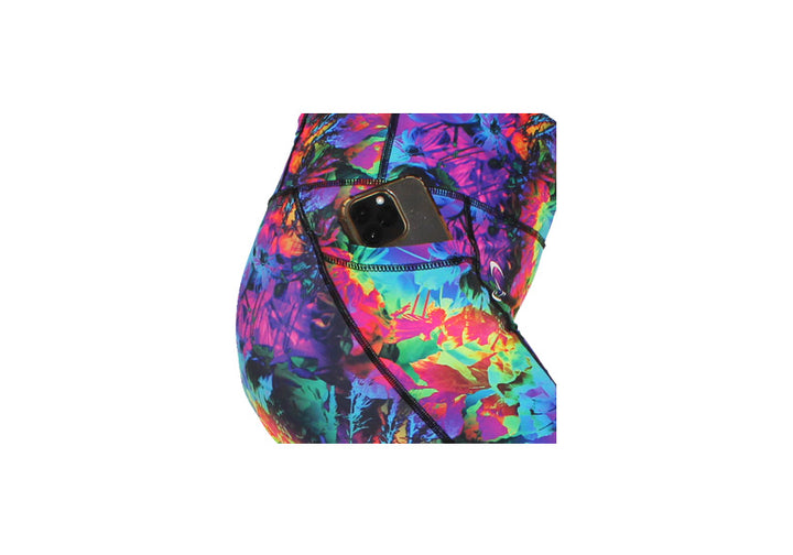 Enhance your workout wardrobe with the Fluorescent Flora Capri Length High Waist Sports Running Leggings, uniquely designed to glow under UV light. These leggings boast a vivid neon floral pattern that illuminates brilliantly in UV settings, ideal for fitness classes or events with black lights. They offer a high-waisted fit for optimal support and comfort, along with a secure rear zip pocket. Choose to add deep thigh pockets on both legs for convenient storage of essentials like phones and keys. Perfect for those who want to combine bold style with practical features in their activewear.